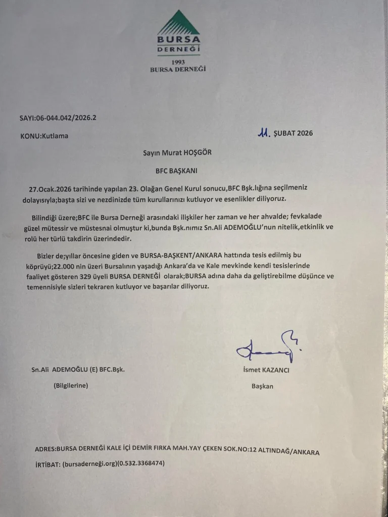 22 Şub HaberlerTebrik Mesajı BFC’nin 23. Olağan Genel Kurulu sonucunda Başkanlığa seçilen Sayın Murat Hoşgör’ü kutluyor, görevinde başarılar diliyoruz.Bursa Derneği olarak iş birliğimizin ve güçlü ilişkilerimizin yeni dönemde de artarak süreceğine inanıyoruz. Acil Eğitim Destek Duyurusu